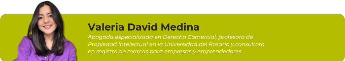 El curso en Propiedad Intelectual con Énfasis en Registro de Marcas está dirigido por Valeria David Medina, abogada especialista en Derecho Comercial de la Universidad Externado y candidata a especialista en Derecho de la Competencia de la Universidad Javeriana. Además, actualmente es profesora de Propiedad Intelectual en la Universidad del Rosario y desde 2020 asesora a emprendedores, empresas y profesionales en la gestión y registro de marcas.
